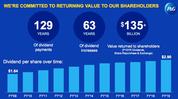 P&G has a long history of rewarding shareholders with dividends. P&G has been paying a dividend for nearly 130 years. It has also earned a place on both the Dividend Aristocrats and Dividend Kings lists. For its various accomplishments, P&G earns a place on our list of “blue chip” stocks. You can see the full list of blue chip stocks here.