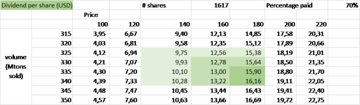 In green, I have highlighted the most likely results based on forecasted production and current iron ore price.