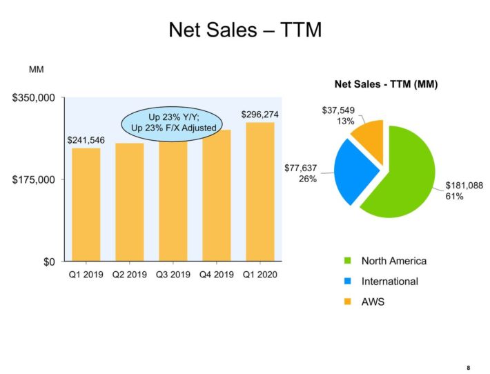 The company has continued to perform well in 2020, as the coronavirus crisis generated even higher demand for Amazon. In the most recent quarter, trailing 12-month sales increased 23% from the same period the previous year.