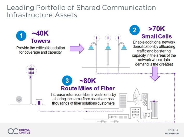 Crown Castle International is structured as a real estate investment trust, or REIT, and operates cell phone towers with small cells where larger towers are not feasible, and fiber connections for data transmission. The trust owns, operates and leases more than 40,000 cell towers and 75,000 route miles of fiber across every major US market, helping it to support data infrastructure across the country.