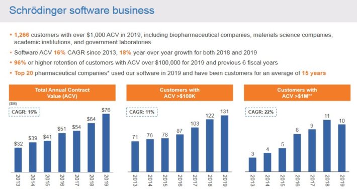 Schrodinger has exciting growth potential, due to the success of its drug delivery platform and its large and diversified customer base. The company has approximately 1,300 customers. From 2017 to 2019, the company’s total revenue grew at a 24% compound annual rate.