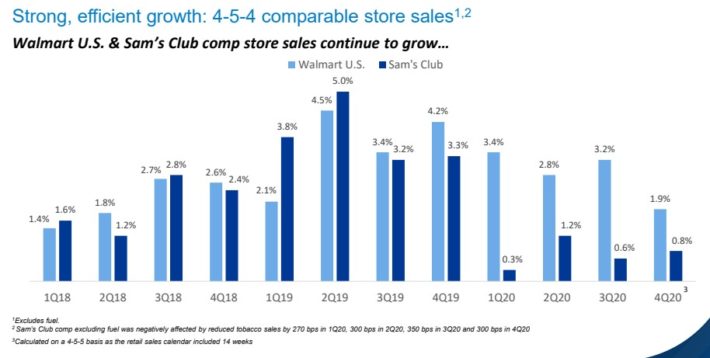 Comparable sales soared 10% in the US and up nearly 10% for the entire company, as the International and Sam’s Club businesses, respectively, grew much more slowly than the core US business.