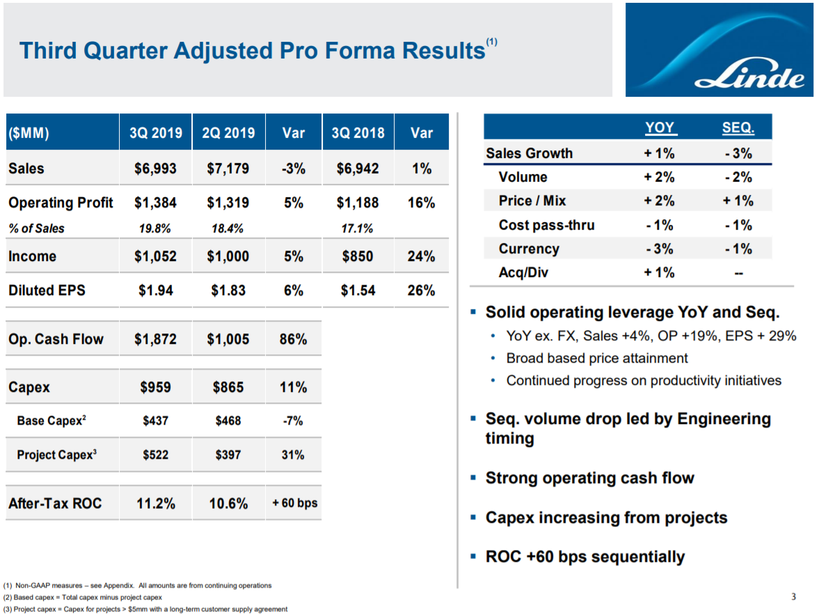 The company did produce year-over-year volume and price/mix growth of 2% each during the quarter, although volume was certainly weak against Q2 of 2019. Management commentary suggests macro weakness globally for Linde’s products, and Q3 results are supportive of this cautious view.