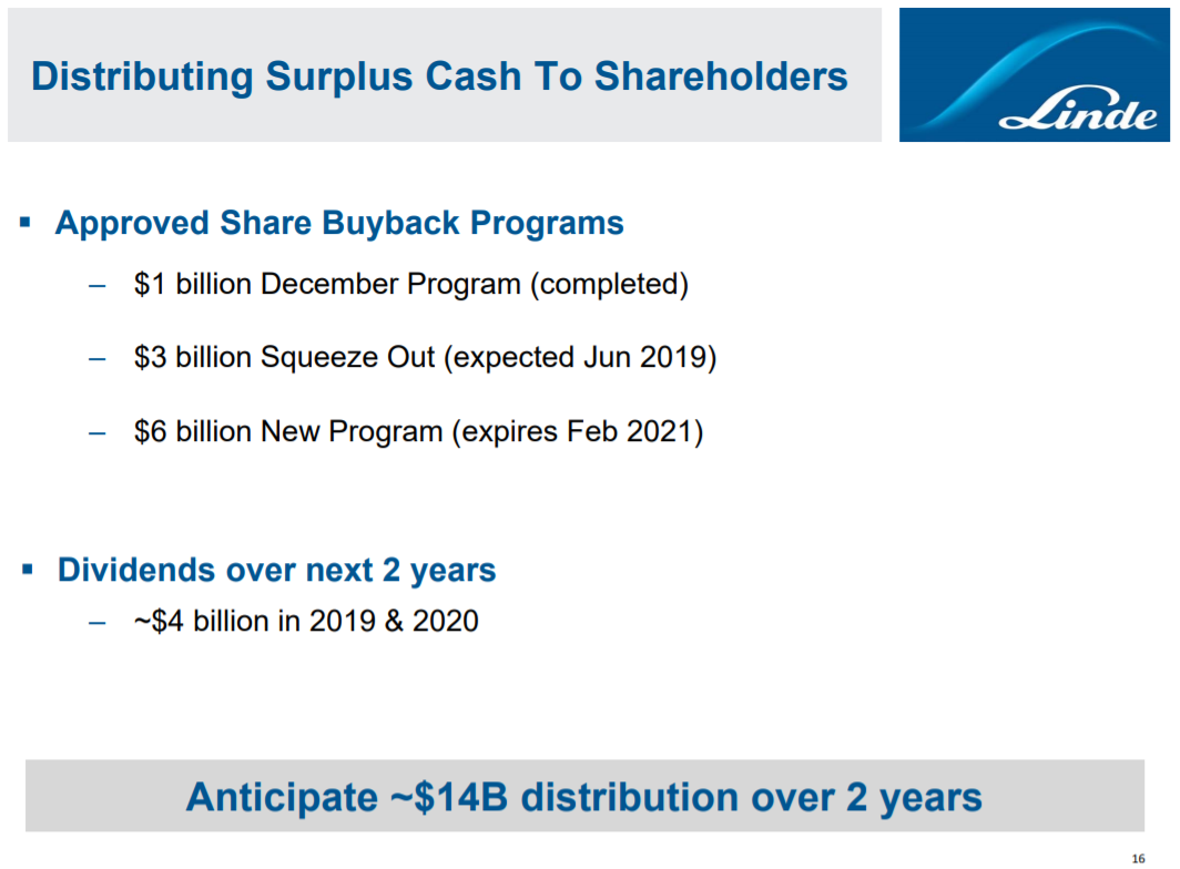 Share repurchases will also be a major catalyst for Linde’s future earnings growth. Linde completed a $1 billion share repurchase program in December of 2018, followed by a $3 billion buy out of Linde shares that weren’t tendered in the merger – “Squeeze Out” as listed above. Finally, the company has another $6 billion program that runs through February 2021.