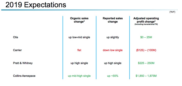 Organic sales are expected to be flat at Carrier and up low to mid-single digits at Otis, while the Collins Aerospace and Pratt & Whitney segments are expected to be up mid-to-high single digits and high single digits respectively.