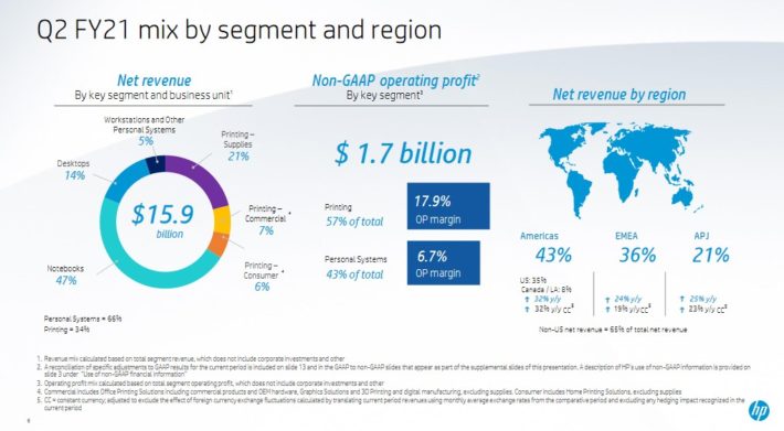 HP reported its second quarter (fiscal 2021) results on May 27. The company reported revenue of $15.9 billion for the quarter, which was up 27% from the previous year’s quarter.