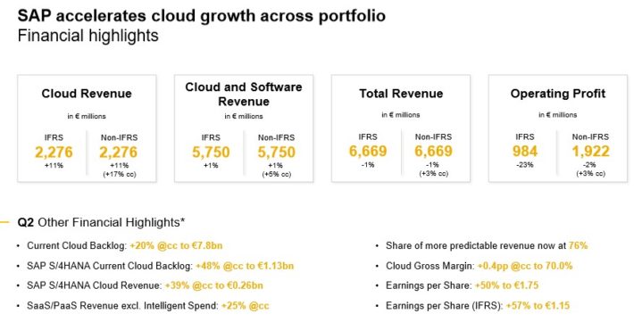 SAP’s earnings–per–share totaled €1.75, or $2.07 on an adjusted basis during the second quarter. This represents a 50% increase year–over–year on an adjusted basis, and profits were way higher than what analysts had forecasted.
