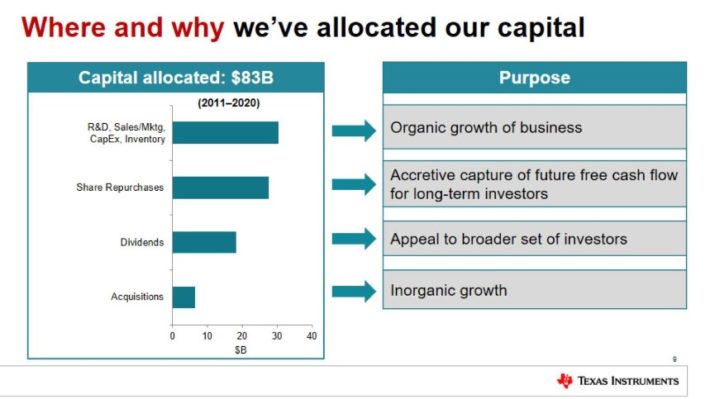 Texas Instruments has effectively allocated capital, with over $80 billion in the past 10 years spread across internal investments and acquisitions designed to generate future growth, while rewarding shareholders with buybacks and dividends.