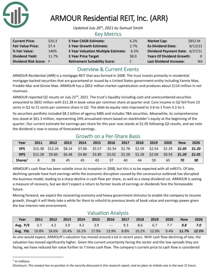 ARMOUR reported Q2 results on July 22nd, 2021. The trust’s liquidity including cash and unencumbered securities amounted to $832 million with $11.28 in book value per common share at quarter end. Core income in Q2 fell from 23 cents in Q1 to 21 cents per common share in Q2. The debt–to–equity ratio improved to 3.6–to–1 from 4.2–to–1.