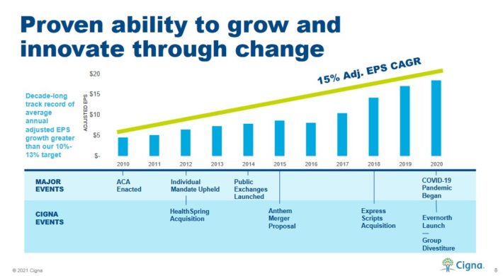 We expect high annual returns above 22% per year for Cigna stock, comprised of 15% annual EPS growth, the 2% dividend yield and a significant boost from an expanding P/E multiple.
