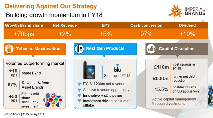 Imperial Brands reported first half of fiscal 2019 results on May 8th. Net revenue increased 2.3% as tobacco revenue grew 2.5% in constant currency. Imperial Brands was able to increase tobacco product prices by over 6%, which more than offset the impact of falling volumes.