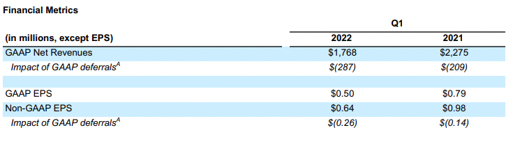 ATVI reported first-quarter results on April 25th, 2022. Revenue for the quarter was down 22.4% to $1.77 billion, missing estimates by $30 million. Earnings were also down by 34.7%, from $0.98 per share in the first quarter of 2021 to $0.64 per share. The company missed estimates by $0.06 per share.