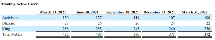 Overall, Activision Blizzard Monthly Active Users (MAUs) for the quarter were 372 million, which decreased by 14.5% compared to 1Q2021.